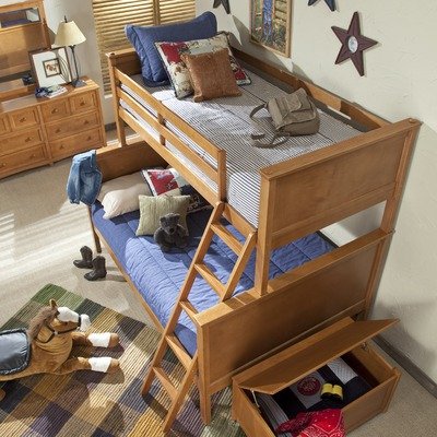 6040 Toy Box and Dresser Not Included A solid panel twin bed with matching full size bed on the bottom, the Twin Over Full Bunk is certainly a bed your child can grow with. Features: -School House collection. -Pecan finish. -Hardwood and veneer construction. -Mattress ready with complete slat system (no foundation required). -Ladder is reversible. -Barrel bolt assembly. -Top of bunk is tested to accommodate an eight inch mattress. -Bunk will convert into two twin size beds. -Assembly required. -Twin over full bunk bed dimensions: 70.75'' H x 81'' W x 56.5'' D..../ School House Twin Over Full Bunk Bed in Pecan / Trundle Twin Bed